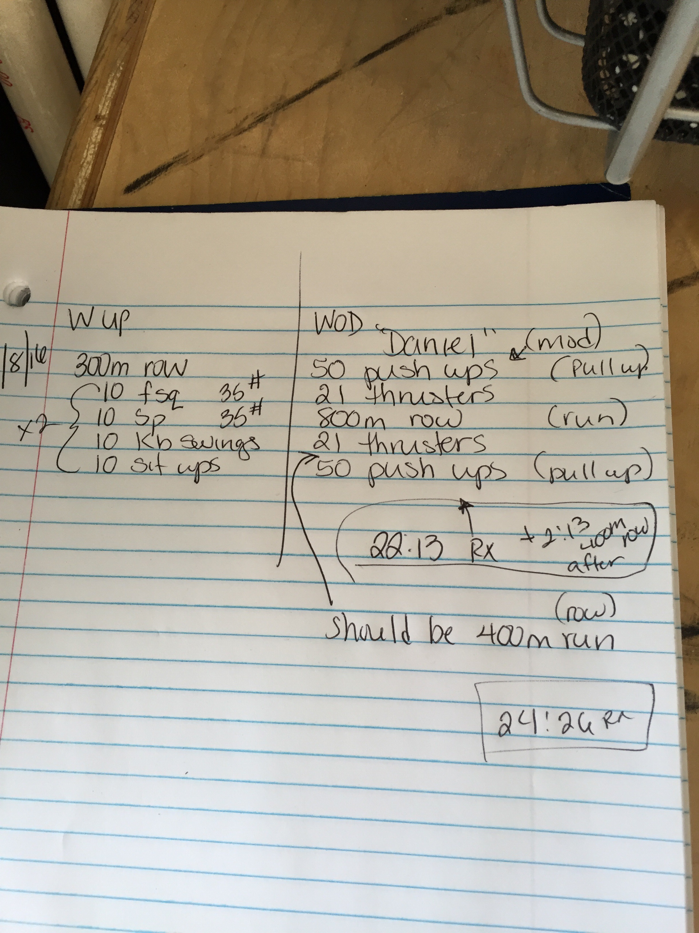 You are here: Home › Crossfit › 2016-06-08 ← 2016-06-07 2016-06-09 → 2016-06-08 WOD “Daniel” modified for home 50 push-ups 21 thrusters (95#) 800m row 21 thrusters (95#) 400m row 50 push-ups Time: 23:45 Rx Leave a Reply Cancel replyYour email address will not be published. Required fields are marked *Comment * Name * Email * Website Δ This site uses Akismet to reduce spam. Learn how your comment data is processed.