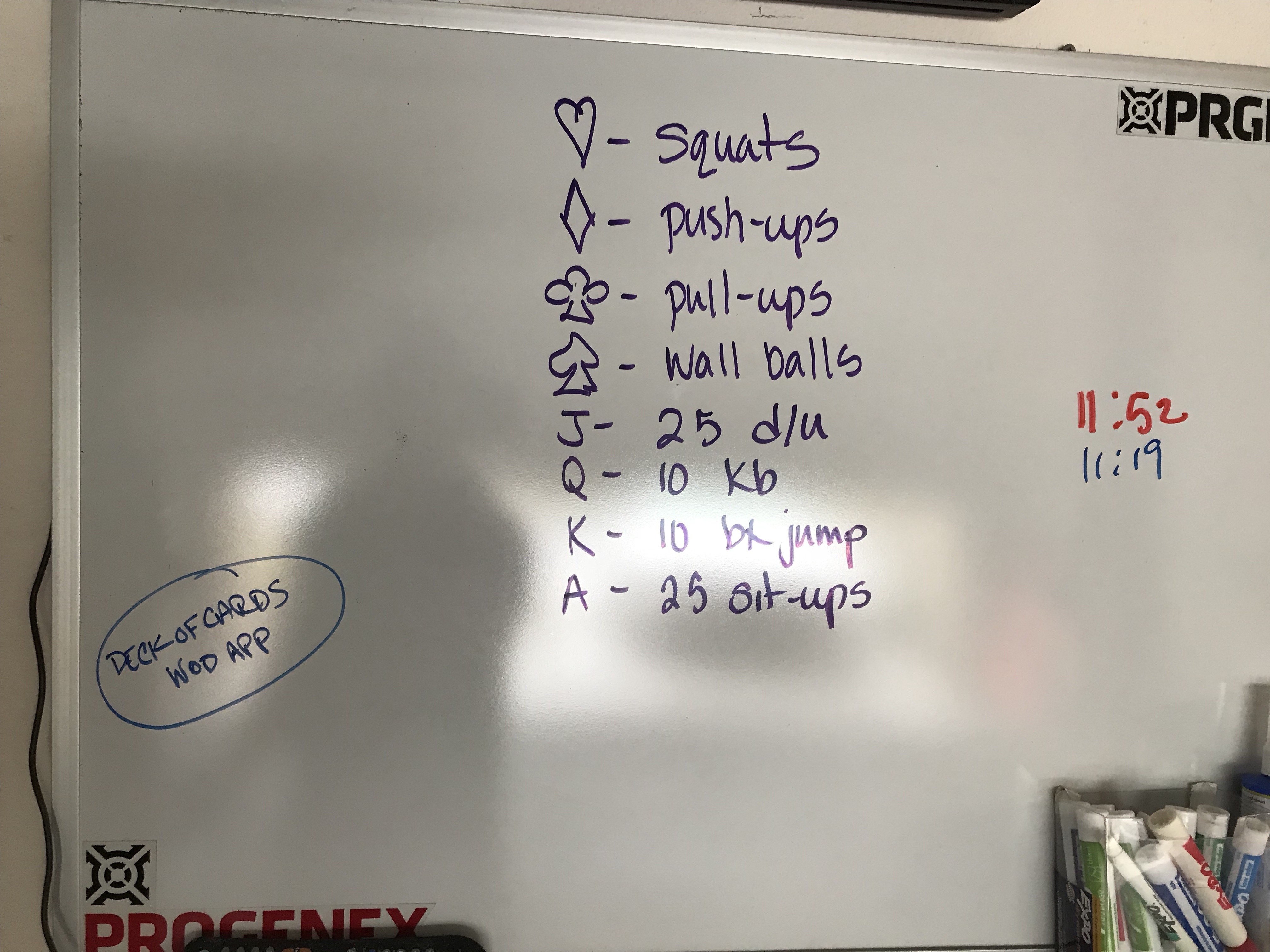 You are here: Home › Crossfit › 2018-03-10 ← 2018-03-09 2018-03-11 → 2018-03-10 WOD “Deck of Cards” Hearts – squats Diamonds – push-ups Clubs – pull-ups Spades – wall balls Jack – 25 d/u Queen – 10 kb (1.5pd) King – 10 box jumps Ace – 25 sit-ups Time: 33:00 Leave a Reply Cancel replyYour email address will not be published. Required fields are marked *Comment * Name * Email * Website Δ This site uses Akismet to reduce spam. Learn how your comment data is processed.